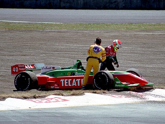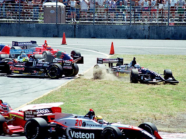 Michael Andretti has to drive across the grass to get round the
