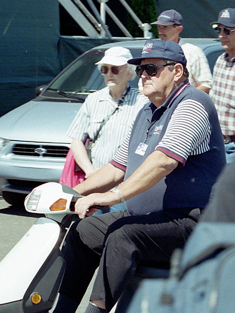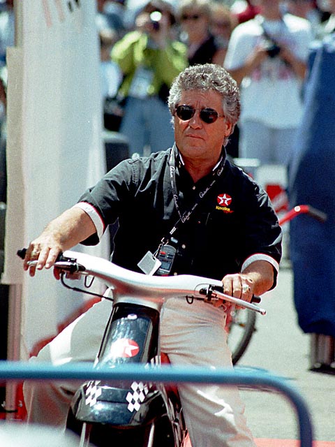 Carl Hogan, owner of the Hogan Racing team, rides by on a scooter.