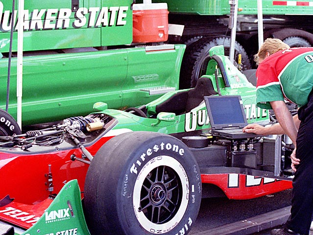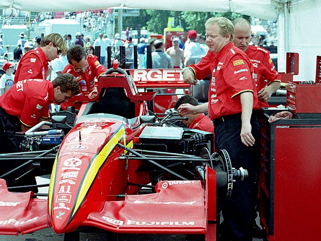 An engineer working on Adrian Fernandez's Tecate car, a Reynard