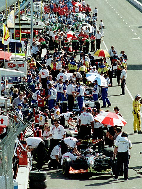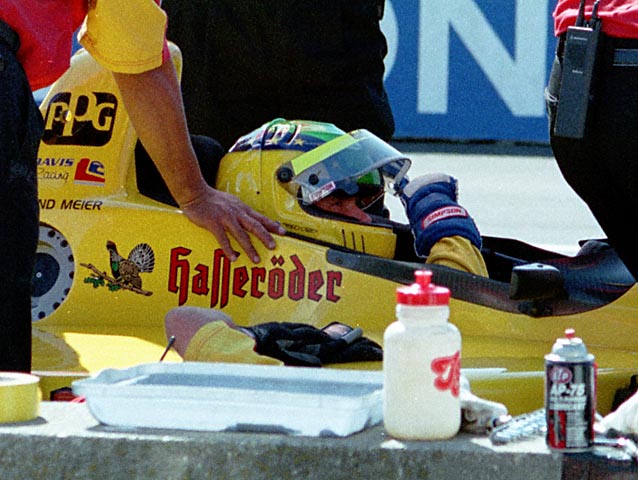 Arnd Meier, in the field's only Lola, takes a pit stop during