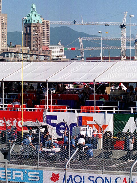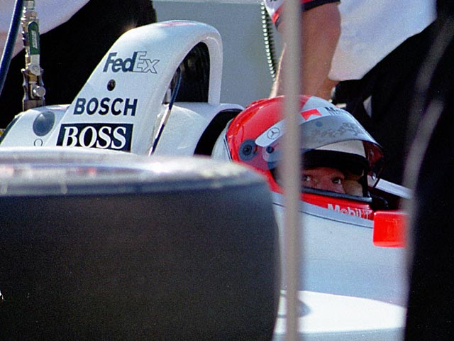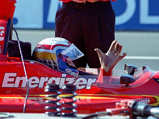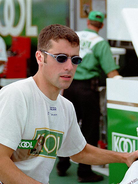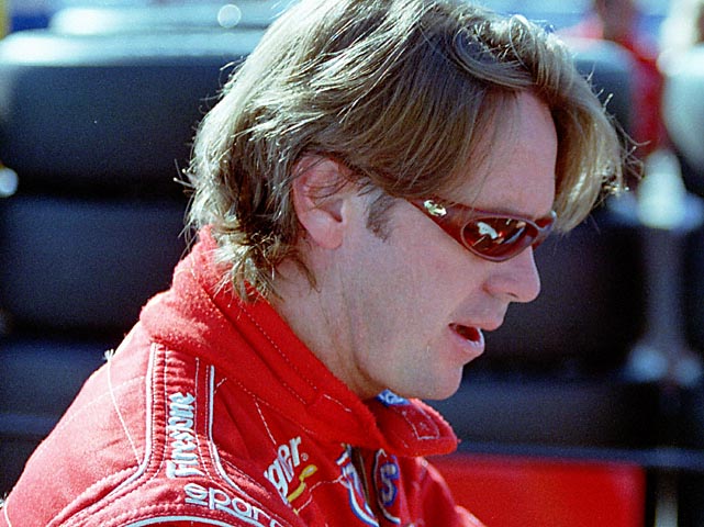 Scott Pruett sits in the Visteon car waiting for practice to resume
