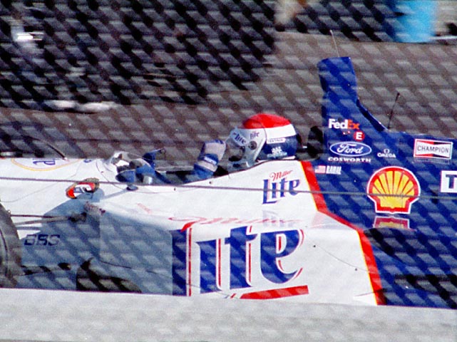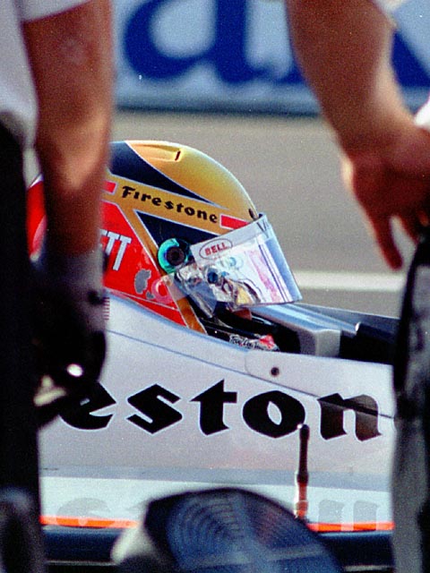 Bobby Rahal raises his visor as he brings the Miller Lite