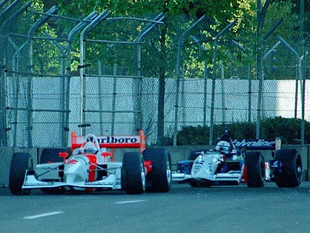 Al Unser, Jr., in the high-nosed Penske leads Gil de Ferran back