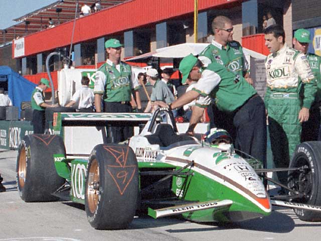Dario Franchitti waits while his crew gets the Reynard-Honda ready