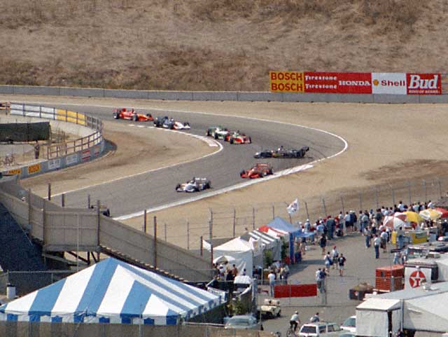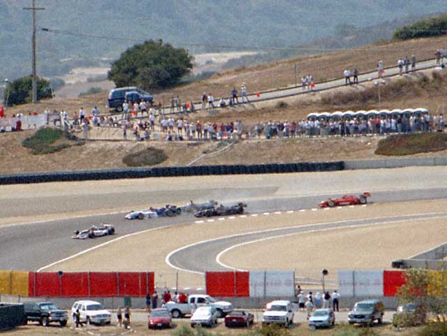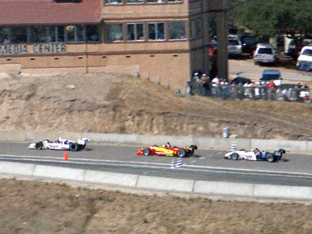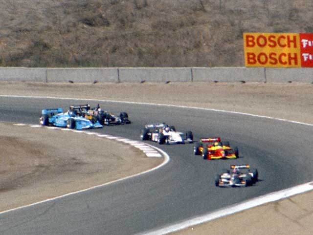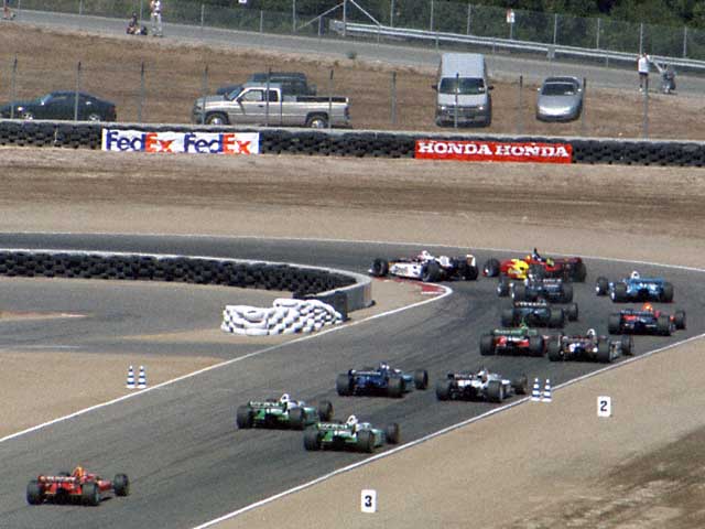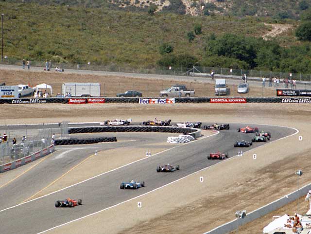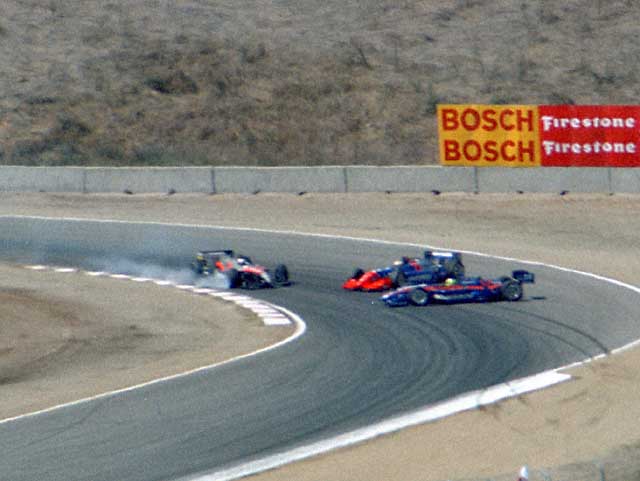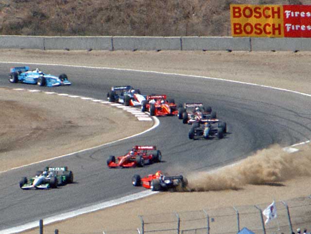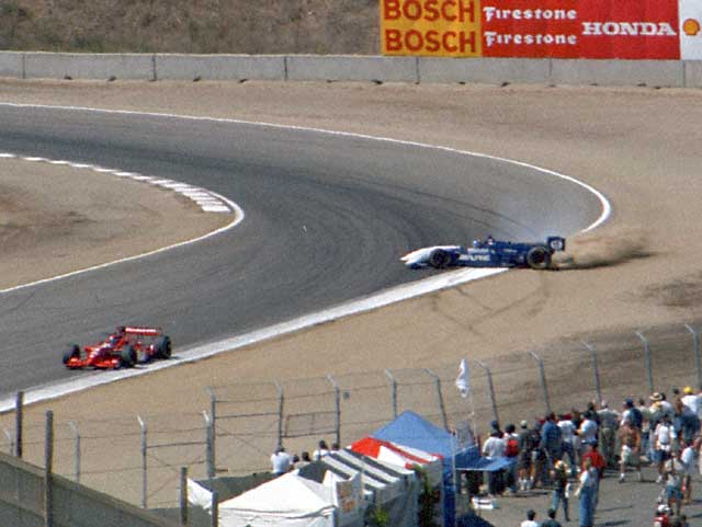 At Turn 2 Greg Moore runs wide, but keeps under control. Further