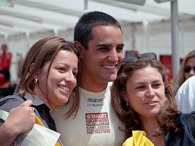 J.P. Montoya obviously enjoying posing with a couple of fans.