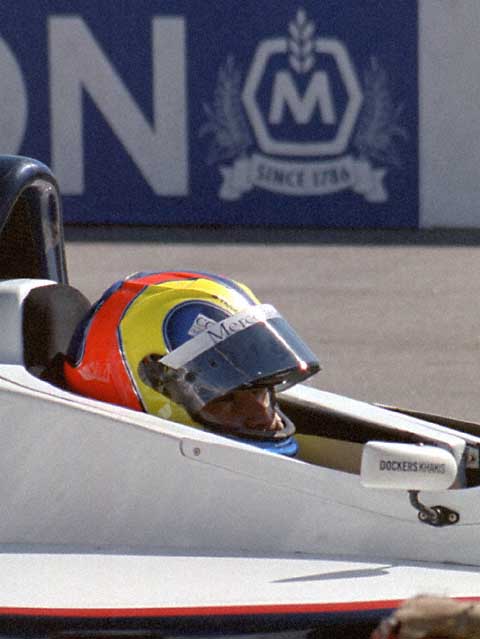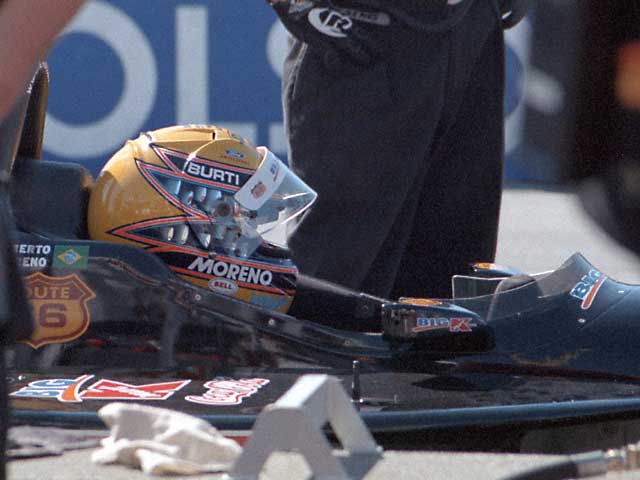 Roberto Moreno, with his distinctive helmet, sits in injured